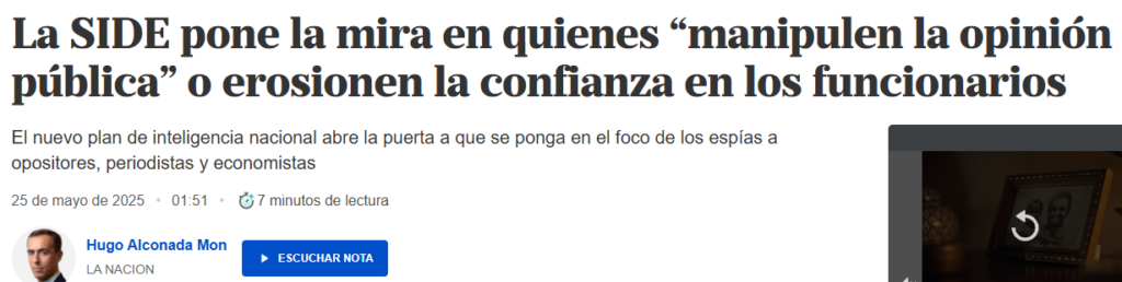 La misma señala que el “el nuevo plan de inteligencia nacional abre la puerta a que se ponga en el foco de los espías a opositores, periodistas y economistas”.