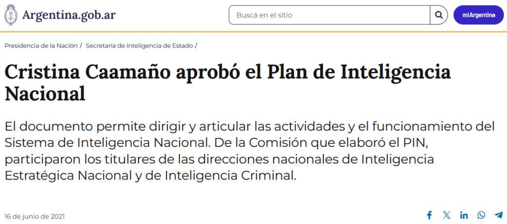 La nota especifica que “La interventora de la Agencia Federal de Inteligencia aprobó el Plan de Inteligencia Nacional (PIN) para los años 2021 a 2024, cuya elaboración está a cargo de la AFI según el inciso 1° del artículo 13 de la Ley de Inteligencia Nacional (N° 25.520, modificada por la Ley N° 27.126).