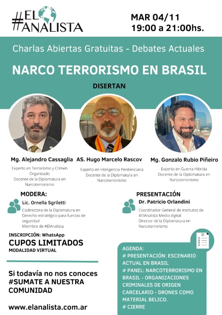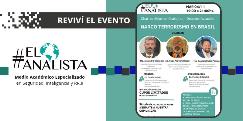 El pasado martes 4 de noviembre, de 19:00 a 21:00 hs, compartimos una nueva Charla Abierta Gratuita – Debate Actual organizada por #ElAnalista, en la que se abordó una problemática de alta relevancia regional: el narco terrorismo en Brasil.